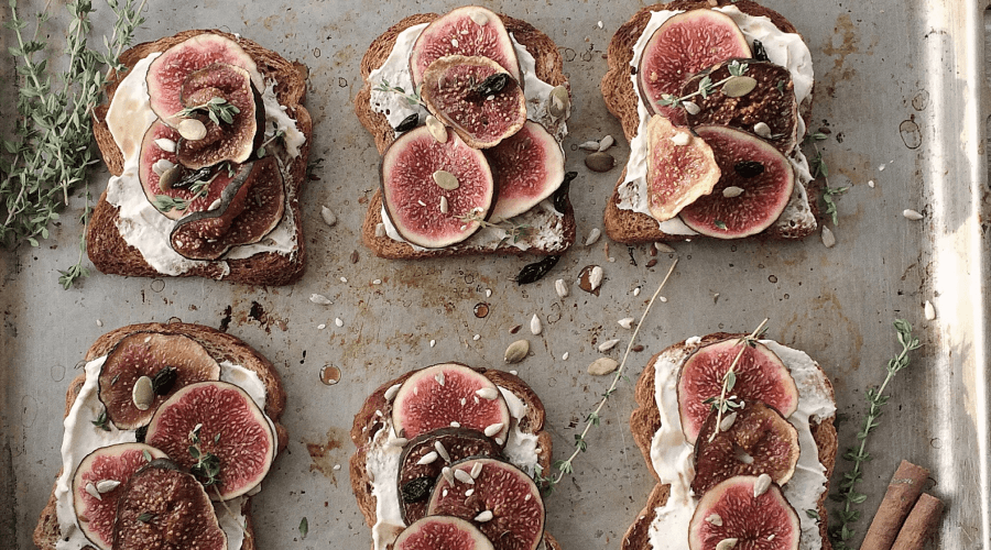 Bread slices with nuts, cheese and fig